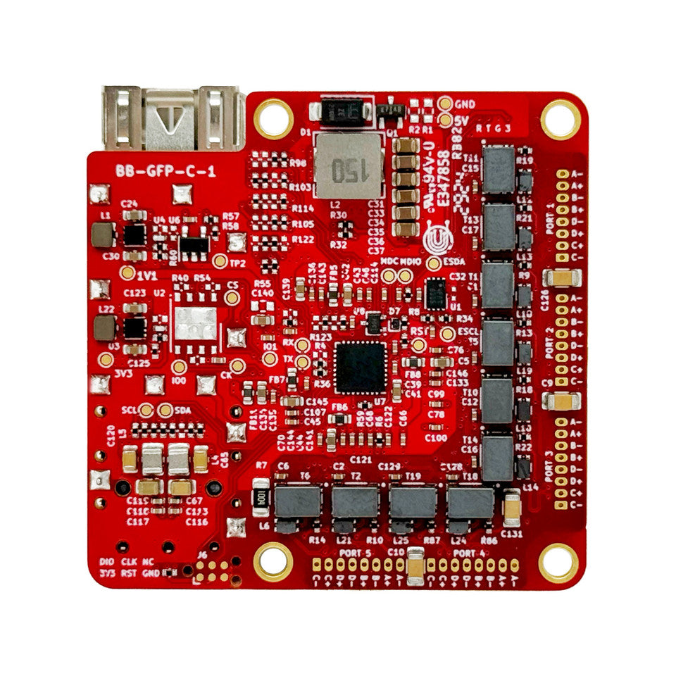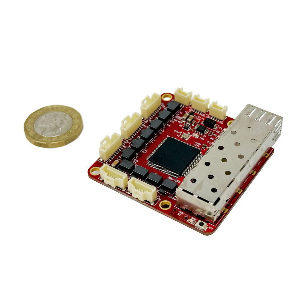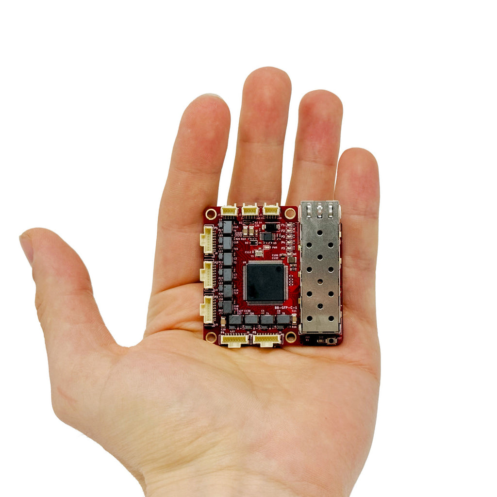 GigaBlox SFP has a footprint of 52.5mm x 52.5mm, and runs from a very wide input voltage of 5 - 60V, which is overvoltage and reverse polarity protected. This allows the board to be powered from noisy voltage buses typical in mobile platforms like UAVs, USVs and robots. All ports on GigaBlox SFP are galvanically isolated from each other.