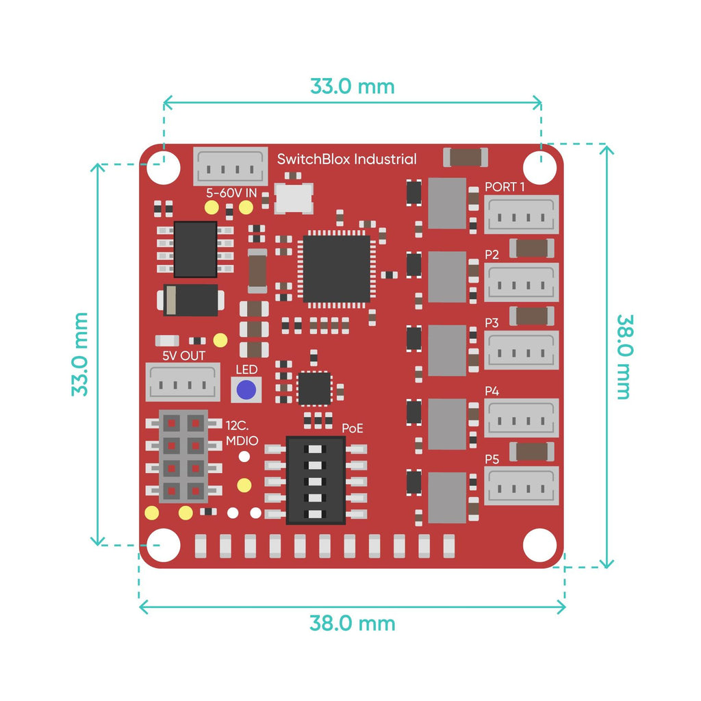 SwitchBlox Industrial provides the same five 10/100Mbps ethernet ports as SwitchBlox, however it achieves this in a 38mm (1.49 inch) square rather than a 44.5mm (1.75 inch) square.