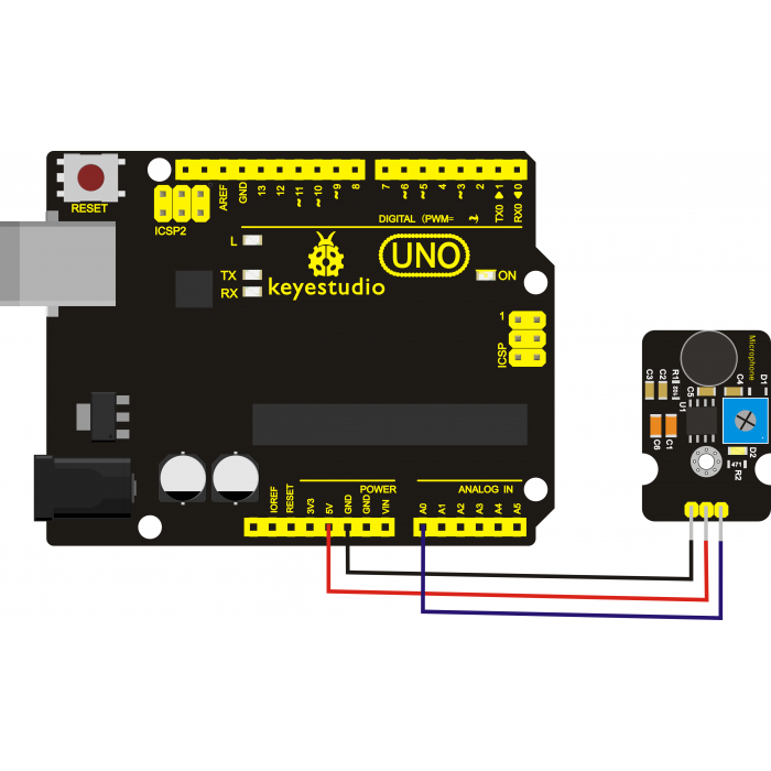 The Keyestudio Analog Microphone Sound Noise Sensor detects ambient sound levels and outputs a real-time voltage signal via its analog interface. Equipped with an adjustable potentiometer, it allows precise control of signal gain to suit different environments. The sensor includes a fixed mounting hole for easy installation on various devices, making it ideal for interactive projects such as voice-activated switches and sound-responsive applications.