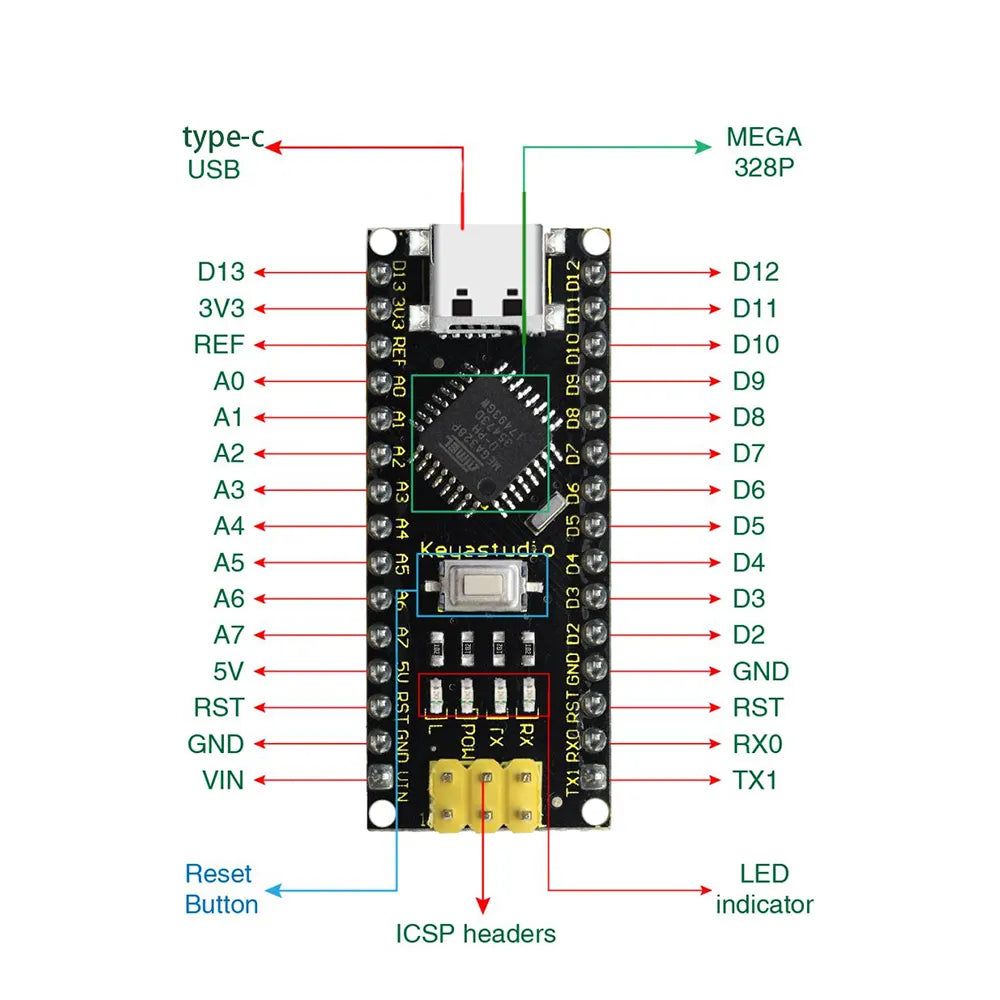 The Keyestudio NANO PLUS Development Board features the ATMEGA328PB-AU processor core, identical to the official Arduino Nano but enhanced with a CH340C USB-to-serial chip and driver. It includes 14 digital I/O pins (6 PWM-capable), 8 analog inputs, a 16 MHz crystal oscillator, an ICSP interface for programming, and a reset button. Power can be supplied via a USB Type-C cable or through VIN/GND ports (DC 7-12V), offering versatile and reliable option for embedded applications.