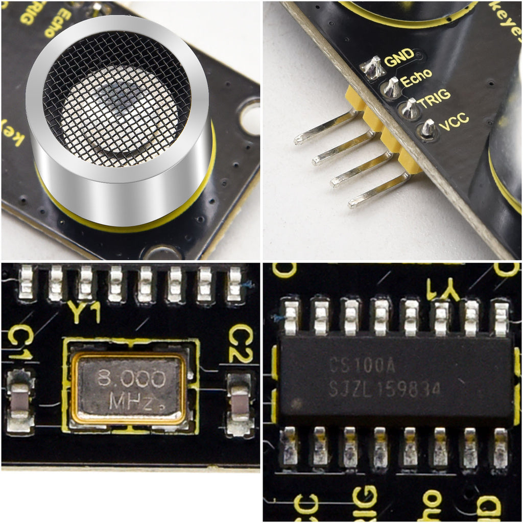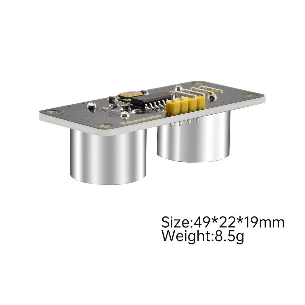 The Keyestudio SR01 CS100A Ultrasonic Sensor V3 is an affordable and precise distance measurement module compatible with 3.3V and 5V systems. This makes it more versatile compared to the HC-SR04. It uses the CS100A chip to emit high-frequency ultrasonic signals, which reflect off obstacles and return to the sensor. By calculating the time difference between sending and receiving these signals, it accurately measures distances up to 3 meters, with a blind zone of less than 4 cm. This sensor is ideal for applications requiring reliable obstacle detection and distance sensing.