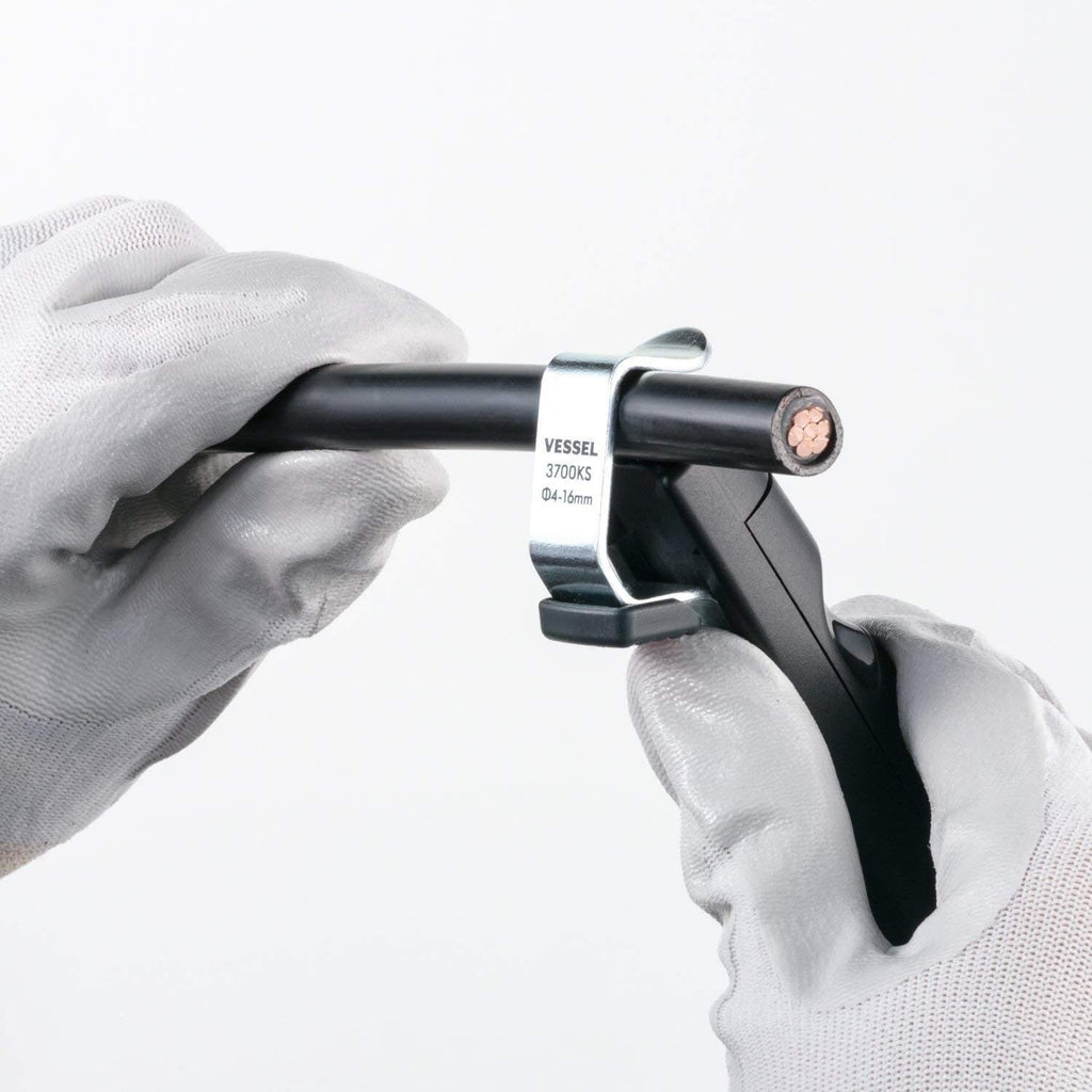 The VESSEL 3700KS 4-16mm Cable Stripper makes stripping wires quick and efficient with its easy-turning mechanism. The non-slip pad and adjustable cutting depth allows stripping cables with outer diameters between 4 and 16mm, while its compact design makes it portable and lightweight. This stripper is a reliable tool for wire stripping tasks.